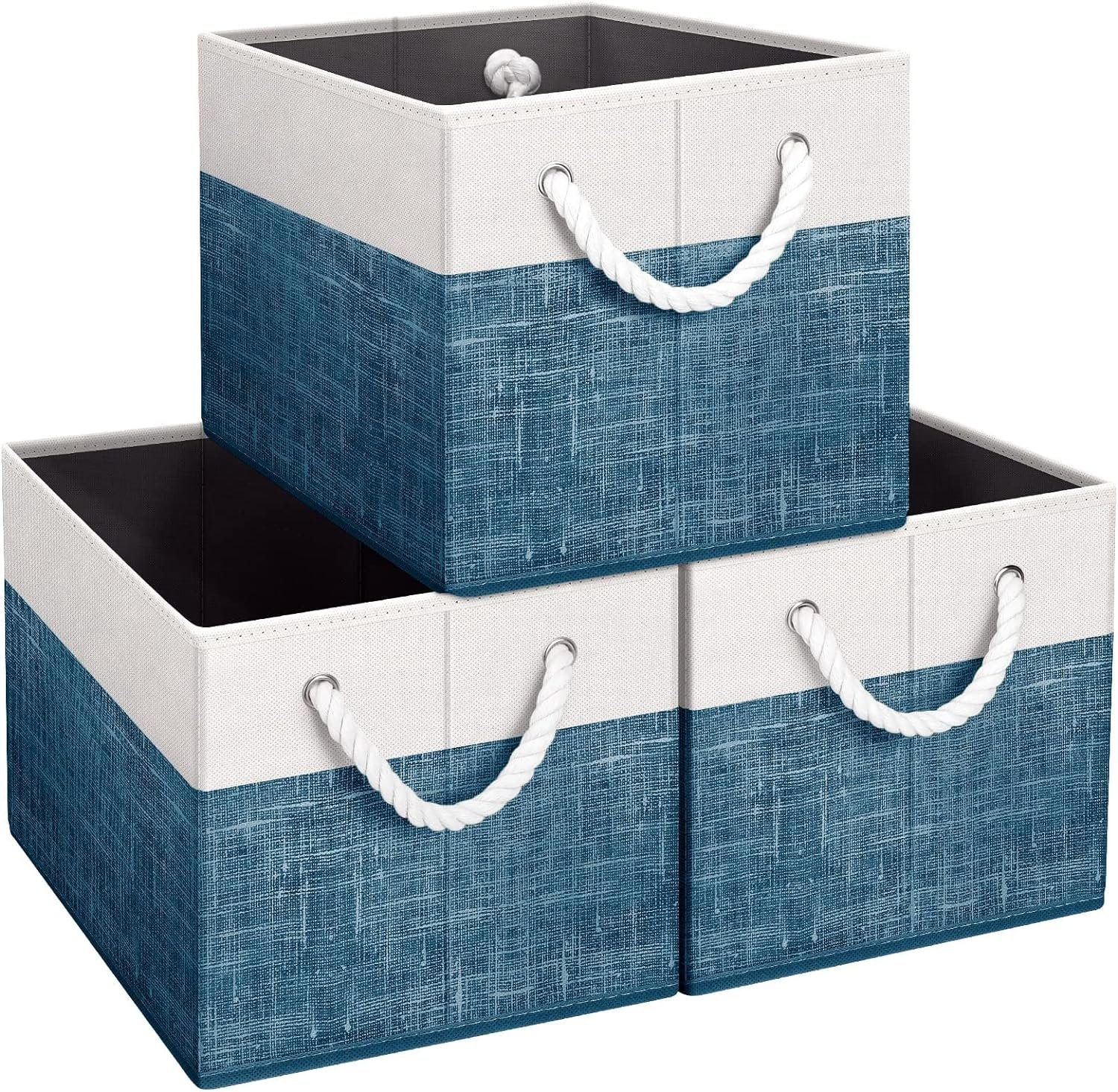 Storage Bins [3-Pack], Foldable Storage Baskets for Organizing Toys, Books, Shelves, Closet, Large Storage Box with Rope Handles, Sturdy Organizer Bins, White & Blue